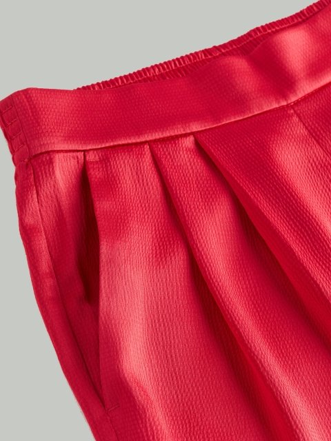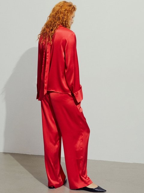 Loose-fit trousers in softly draping satin. High waist with covered elastication at the back and a zip fly with a concealed hook-and-eye fastener. Diagonal side pockets and wide, straight legs with pleats at the top.