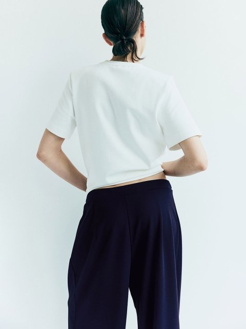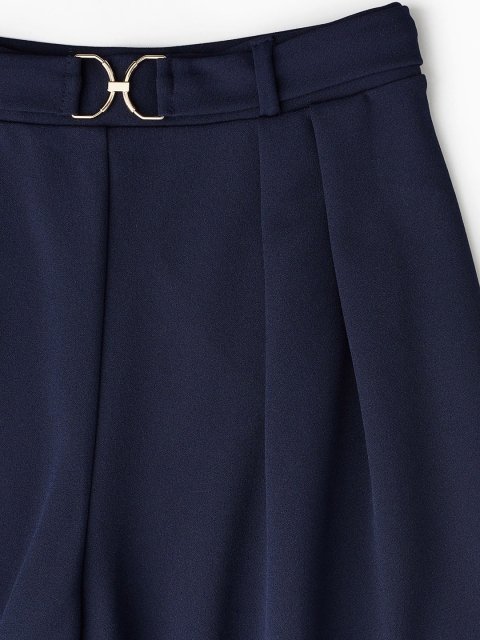 Tailored trousers in jersey crpe with a high, elasticated waist, pleats at the front and a decorative belt with a metal buckle. Straight, wide legs.