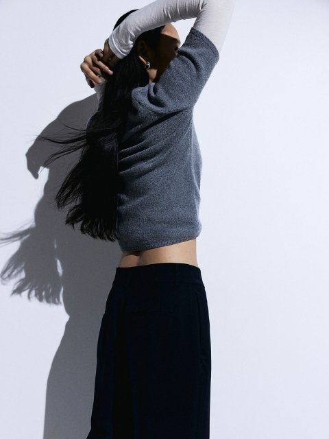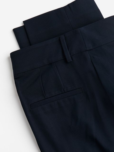 Cigarette trousers in woven fabric. Regular waist with concealed elastication, a hook-and-eye fastener and zip fly. Side pockets, fake back pockets and tapered legs with creases.