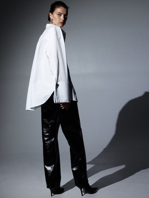 Slim-fit, 5-pocket trousers in coated fabric with a high waist, zip fly and button, and straight legs.