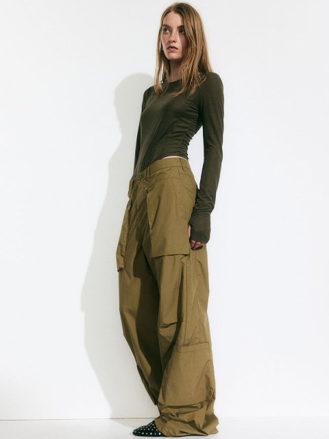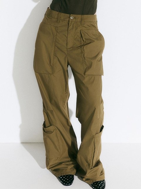 Cargo trousers in a soft cotton weave with patch front and leg pockets. High waist with a zip fly and button and straight legs with a pleat at the knees to create added volume.