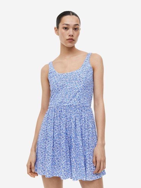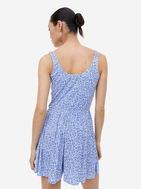 Sleeveless playsuit in viscose jersey. Fitted bodice with shaping seams at the front, wide shoulder straps and a deep neckline at the front and back. Elasticated seam at the waist and gently flared legs. Lined at the top.