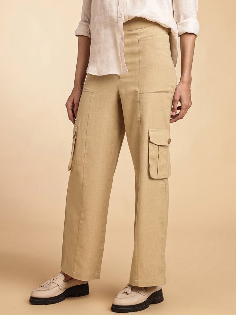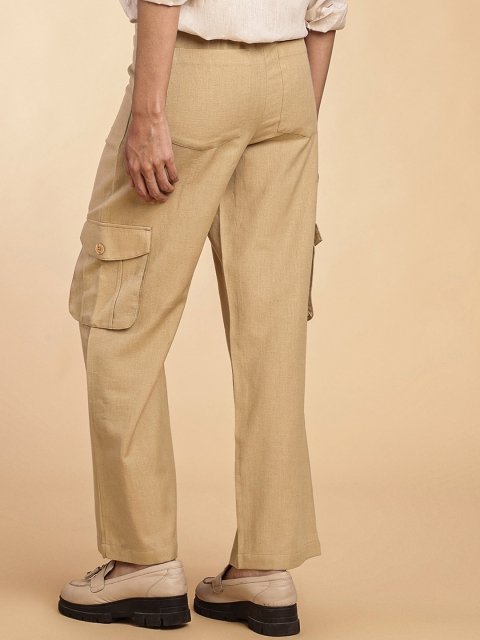 Stylish cargo trousers in Cotton-Linen blend. Mid waist with covered elastication at the back and a zip fly with a botton. Horizontal side pockets and each with an additional big flap pocket on the front and regular pockets at back. Straight legs with sewn-in creases at the front and back.