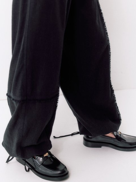 Loose-fit trousers in an airy weave made from a linen and viscose blend. Covered elastication and a drawstring at the waist and diagonal side pockets. Visible seams at the front and back with frayed edges at the front. Drawstring at the hems.