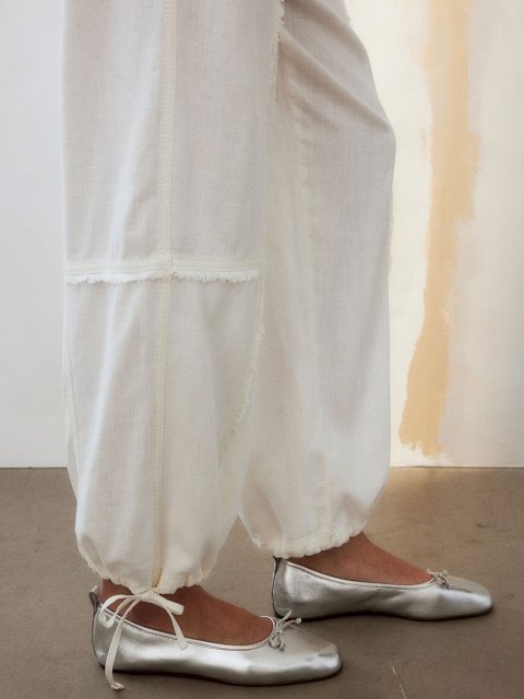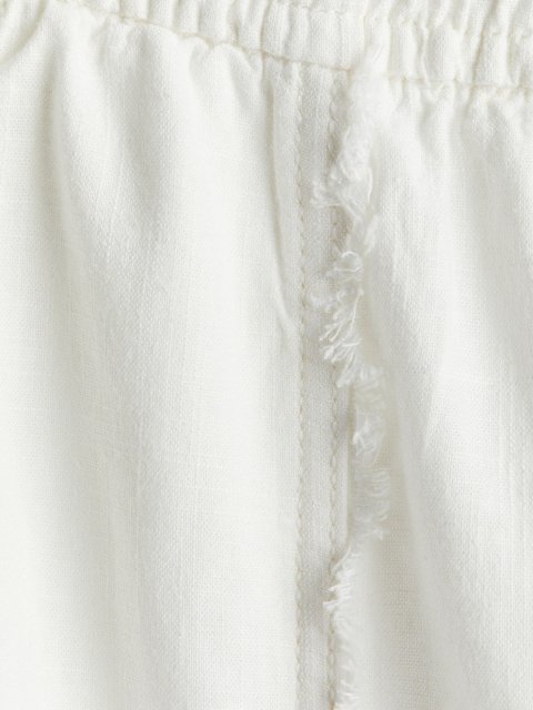 Loose-fit trousers in an airy weave made from a linen and viscose blend. Covered elastication and a drawstring at the waist and diagonal side pockets. Visible seams at the front and back with frayed edges at the front. Drawstring at the hems.