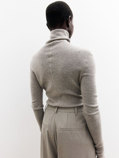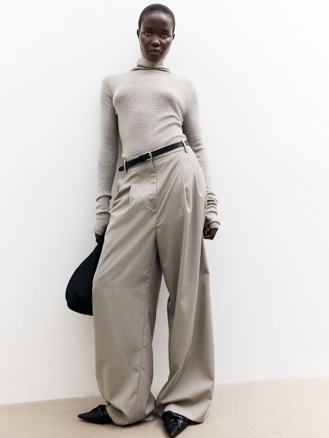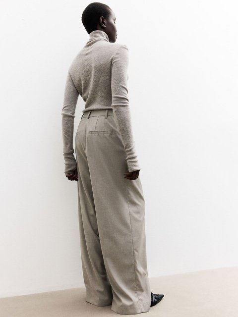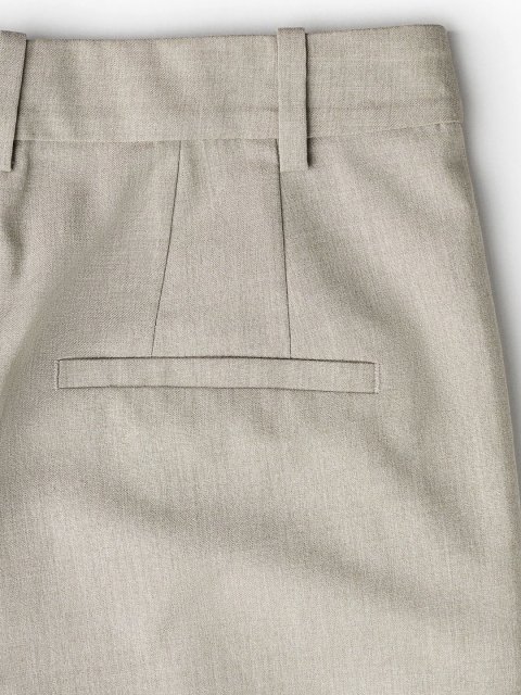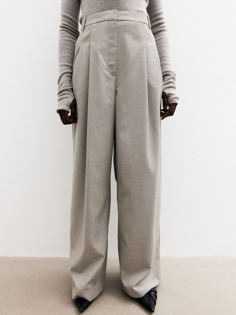 Tailored, loose-fitting trousers in woven fabric. High waist with concealed elastication and a zip fly. Diagonal side pockets and fake welt back pockets. Wide, straight legs with pleats at the front.