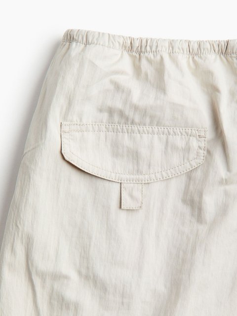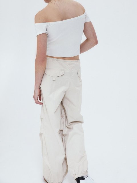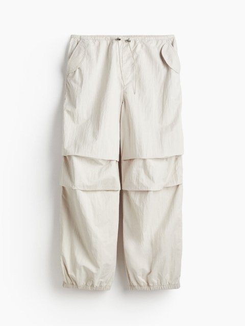 Loose-fit trousers in woven fabric featuring a regular waist with covered elastication and a drawstring with cord stoppers. Fake fly, flap side pockets and fake back pockets with a flap. Legs with pleats at each side of the knees to create added width. Covered elastication at the hems.