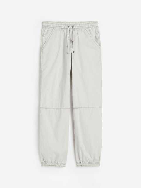Trousers in a soft cotton weave that have a low waist with covered elastication and a drawstring. Fake fly, diagonal front pockets, fake welt pockets at the back, a visible seam at the knees and covered elastication at the hems.