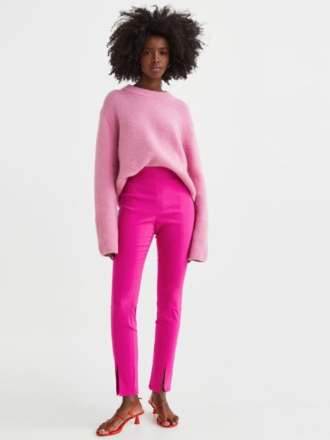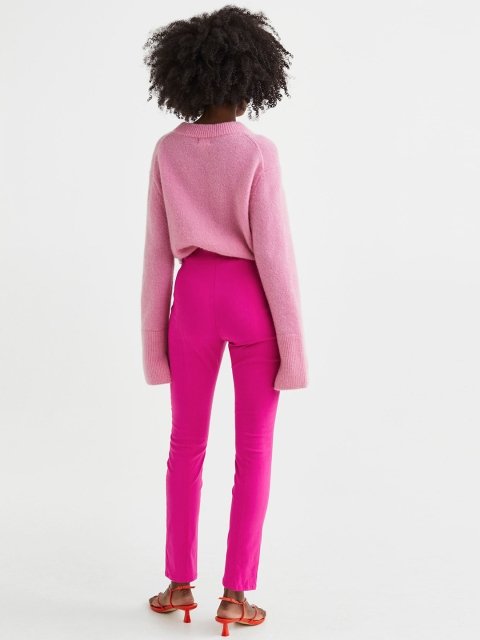 Ankle-length trousers in woven fabric made from a viscose blend. High, elasticated waist with a concealed zip and button in one side, and slim legs with a slit at the front of the hems.