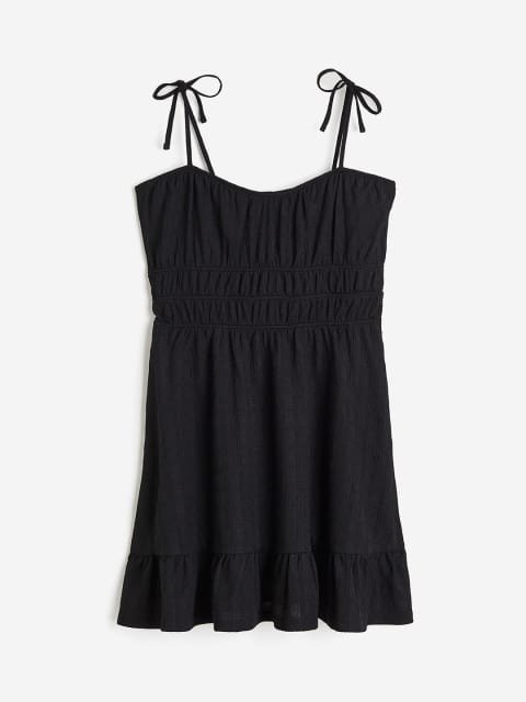 Short dress in textured jersey with a deep, round neckline, tie-top shoulder straps and a smocked section at the waist. Gathered seam above the hem to create added width.