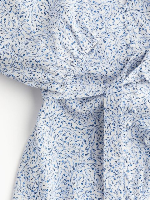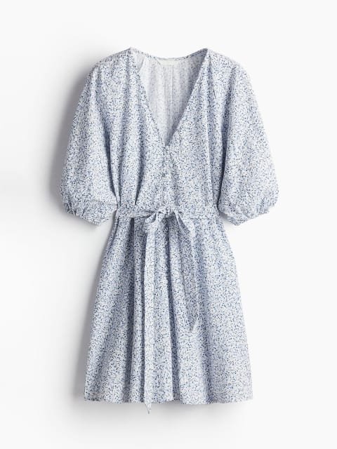 Short dress in a cotton crepe weave with a deep V-neckline and covered buttons down the front. Elbow-length balloon sleeves in a raglan cut with elasticated cuffs. Detachable tie belt at the waist and a gently flared skirt. Unlined.