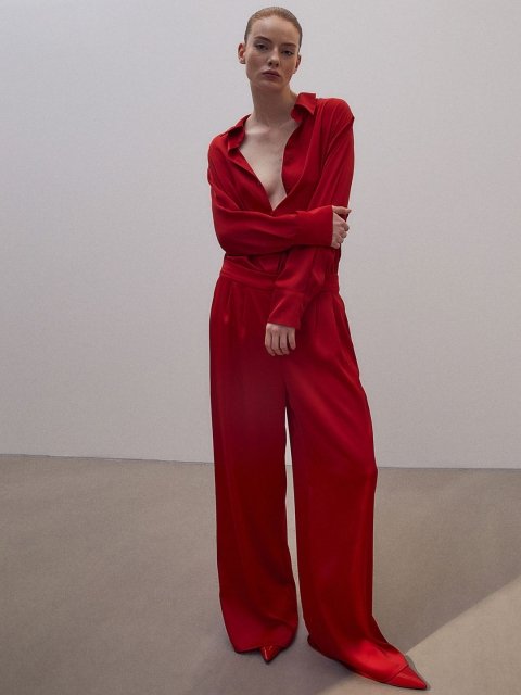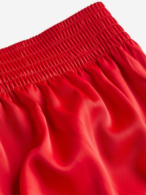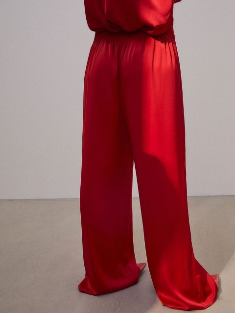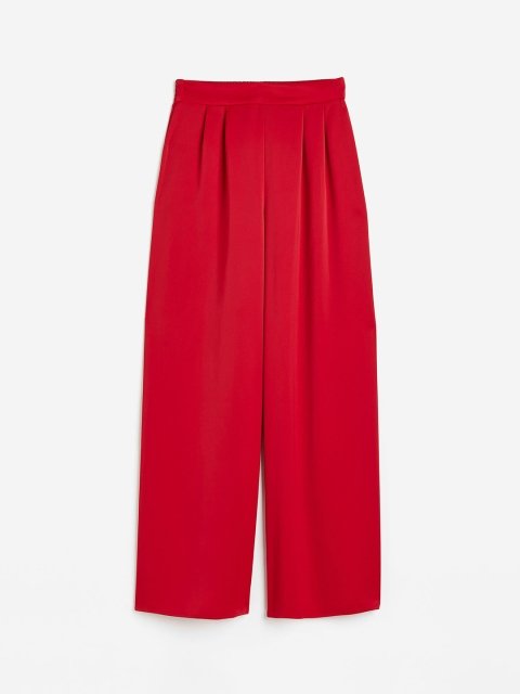 Loose-fit trousers in woven fabric with a slight sheen. High waist with covered elastication at the back and pleats at the front. Wide legs.