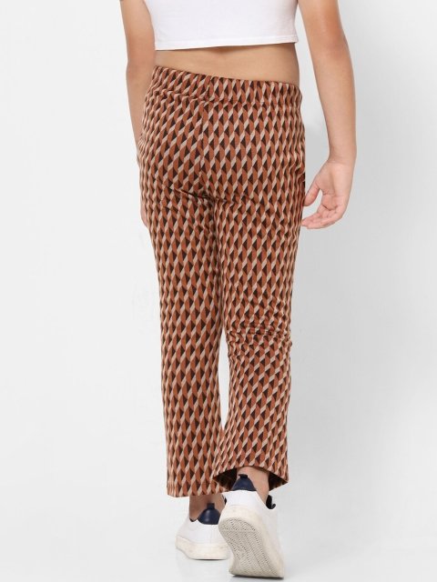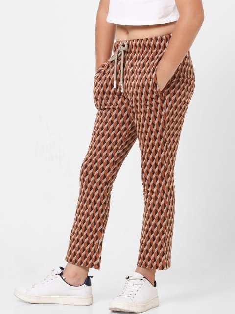A pair of brown printed regular-fit track pants, has an elasticated waistband with drawstring closure and 2 pockets