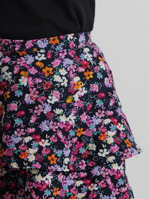 Black and pink floral printed mini-length flared skirt, has a layered details with slip-on closure, and flared hem