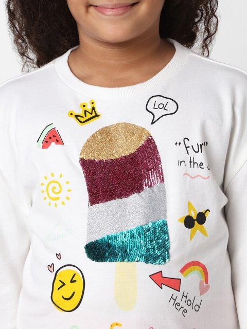 Printed sweatshirt has a round neck, long sleeves, ribbed hem