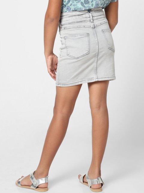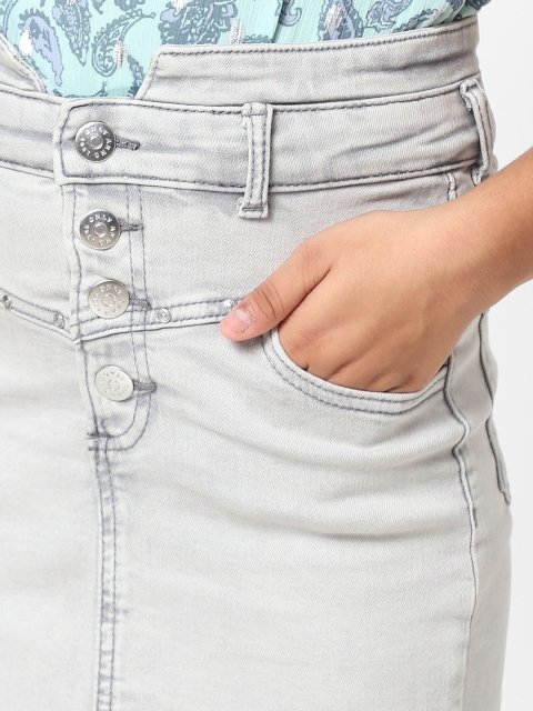Solid high waist mini-length pencil skirt, has an elasticated waistband with button closure and straight hem